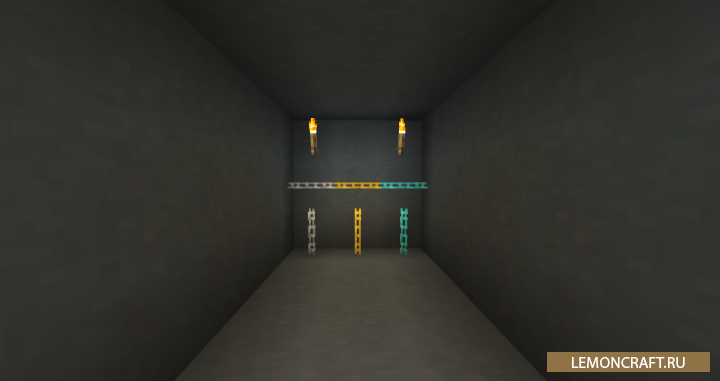 Мод на цепи More Chains добавляет в игру больше вариантов цепей, которые вы сможете применить в различных областях игры. В игре появятся железные, алмазные, золотые и деревянные цепи имеющие различную текстуру. Цепи отлично подойдут, как для украшения, так и для практических целей.
